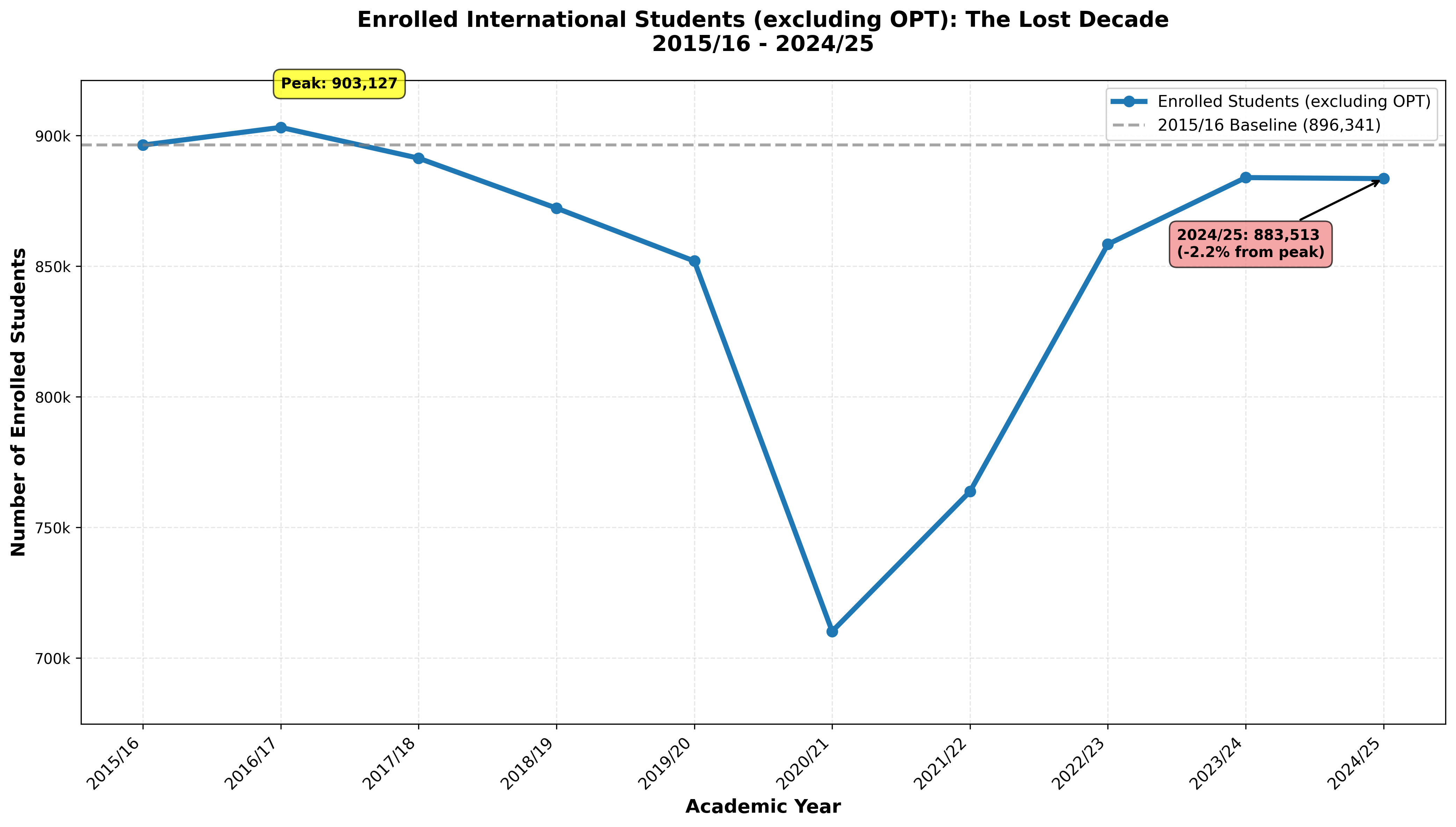 The U.S. enrolled fewer degree-seeking students in 2024/25 (883,513) than in 2015/16 (896,341). Strip out OPT, and enrollment has been stagnant for a decade.
