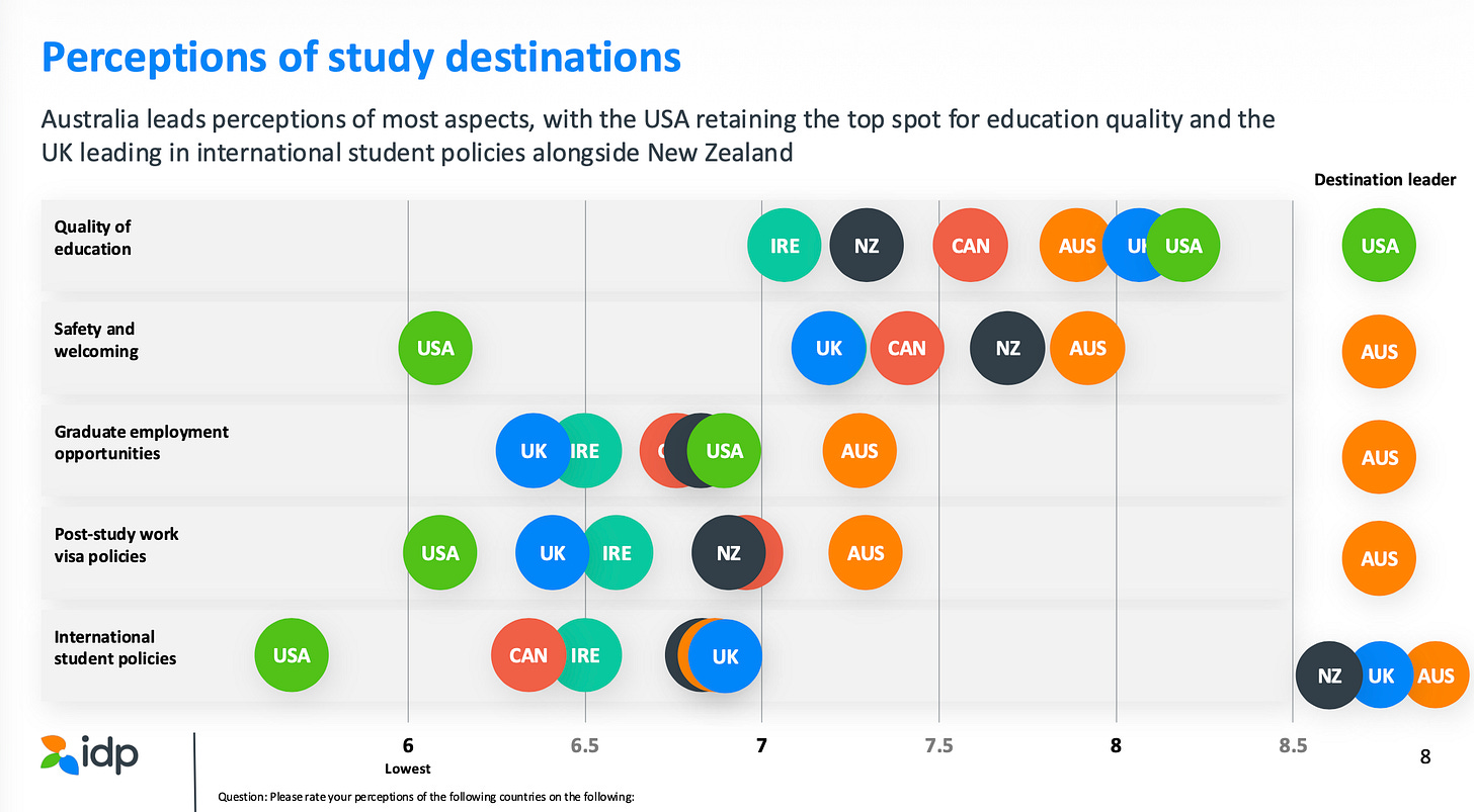 Students aren’t rejecting American educational quality: the U.S. still leads on that measure. But they increasingly perceive the visa system as unpredictable and post-graduation pathways as uncertain. Students recognize U.S. universities are excellent but choose destinations offering more predictable pathways with less risk.