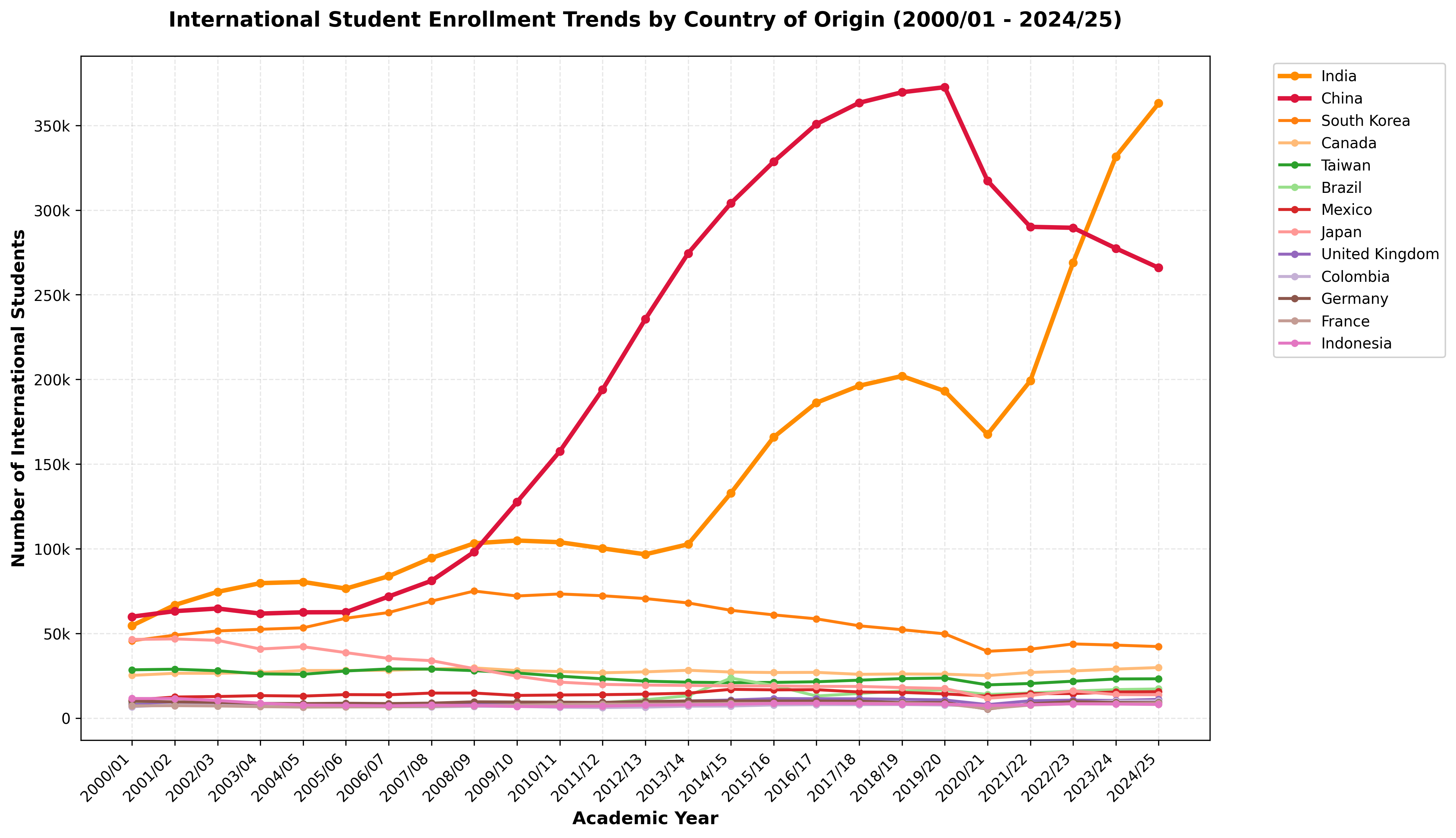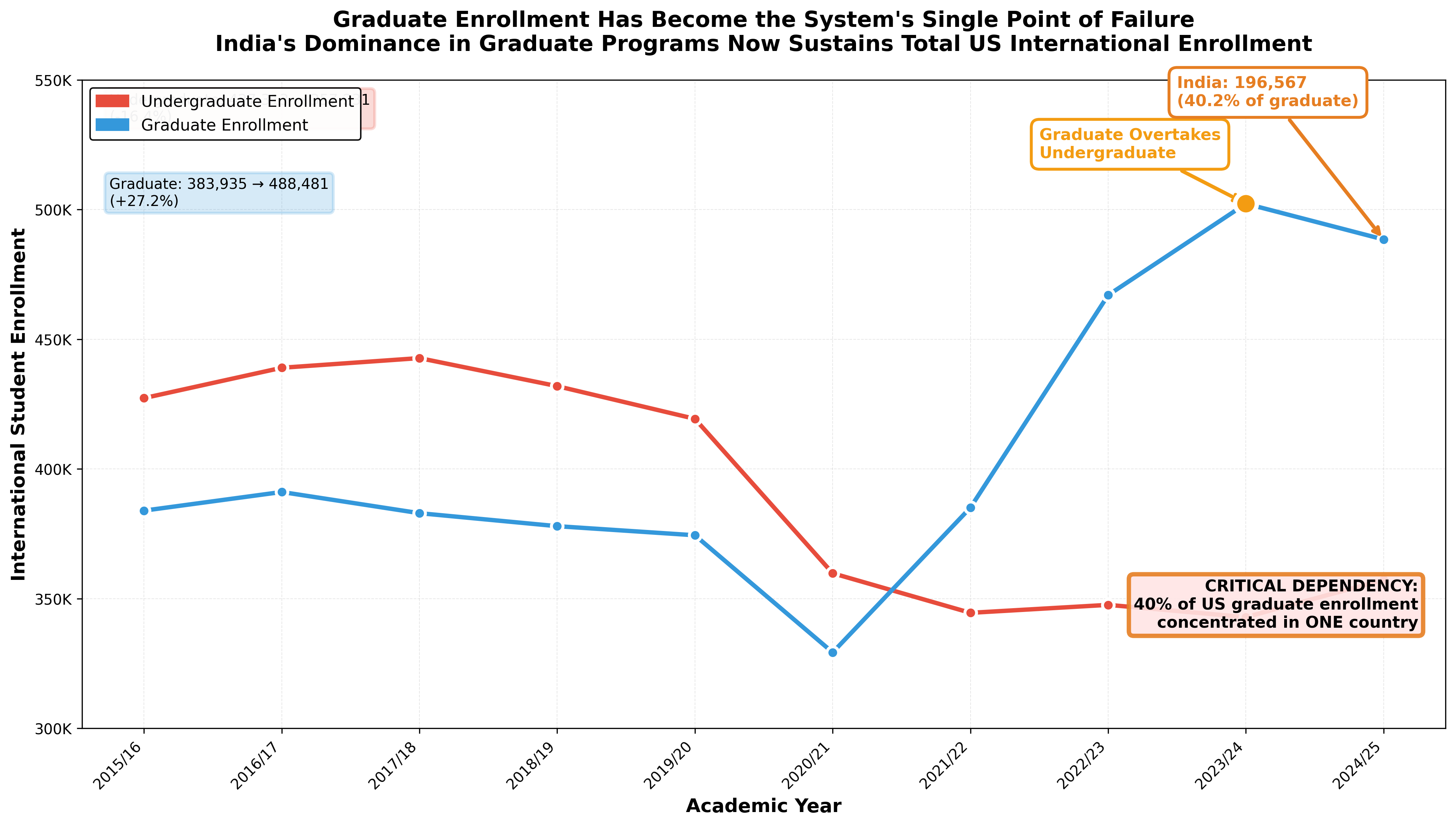 Enrollment from China is down over 15% from 2015/16 (328,547) and over 25% from its 2019/20 pre-pandemic peak (372,532) to 2024/25 (277,398).