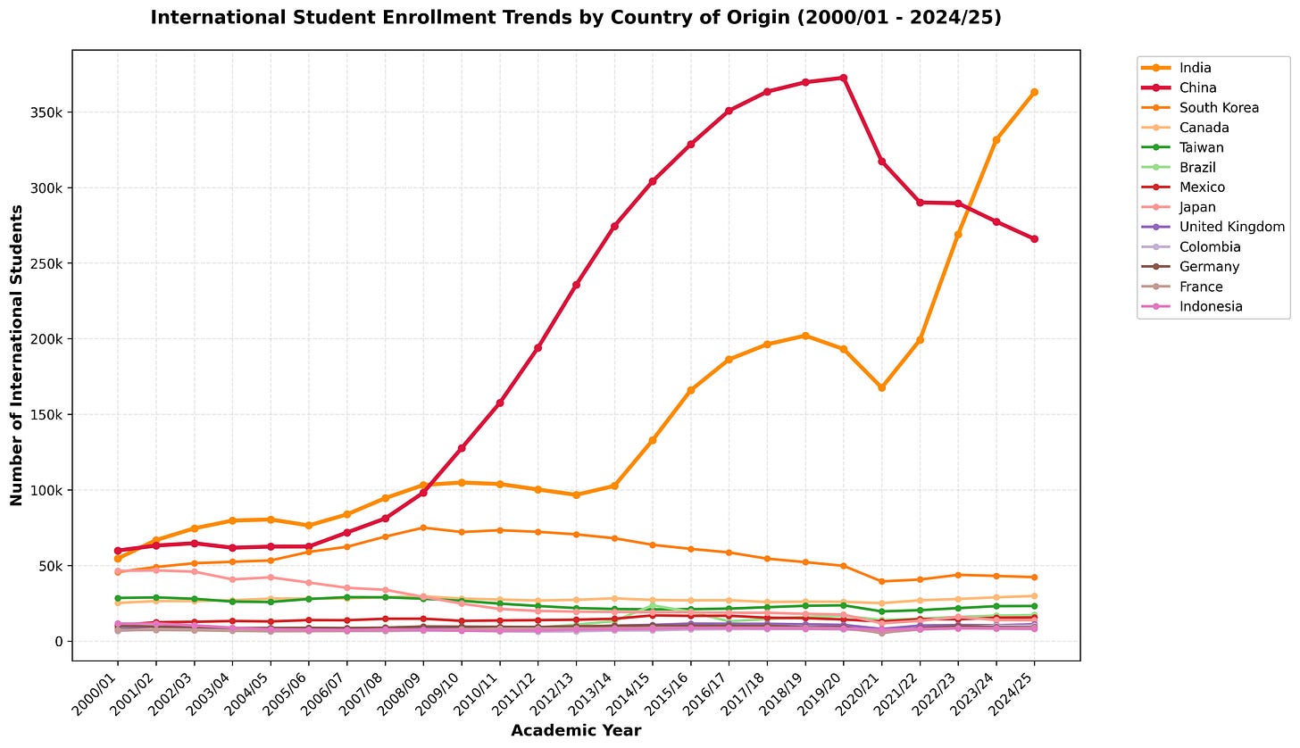 While China declined, India more than doubled—increasing from 165,918 to 363,019 (+120%)—with the surge concentrated in graduate STEM and OPT pathways.