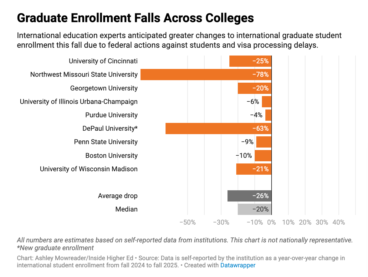 The Fall 2025 data confirms a -12% decline and signals the risk of sustained graduate enrollment contraction in what has been holding up the sector.