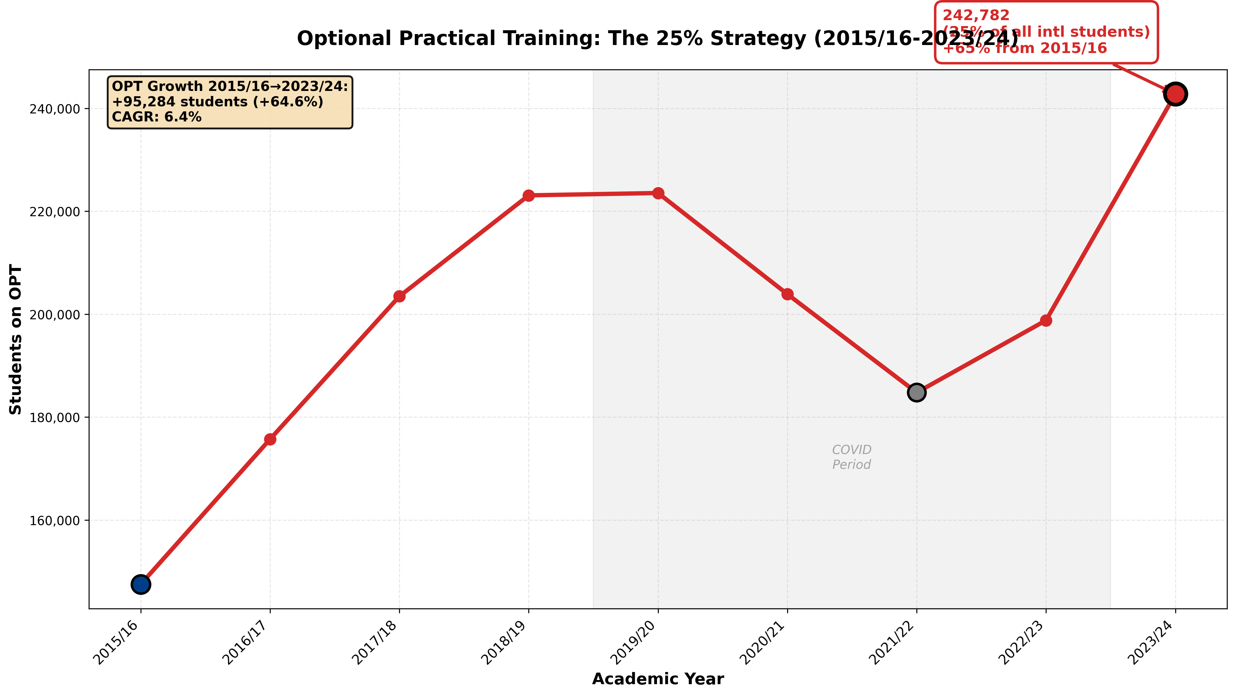 Optional Practical Training (OPT) students now comprise 25% of the 1.2 million total international students: up from 16% ten years ago. STEM OPT alone surged 34.3% in one year from 2023/24 to 2024/25.