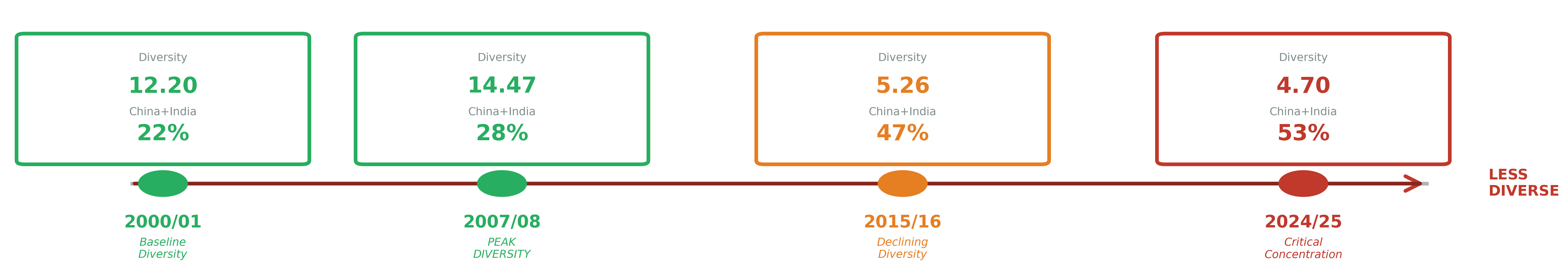 By 2015/16, compositional diversity decreased to 5.26, with China and India representing 47% of the population.