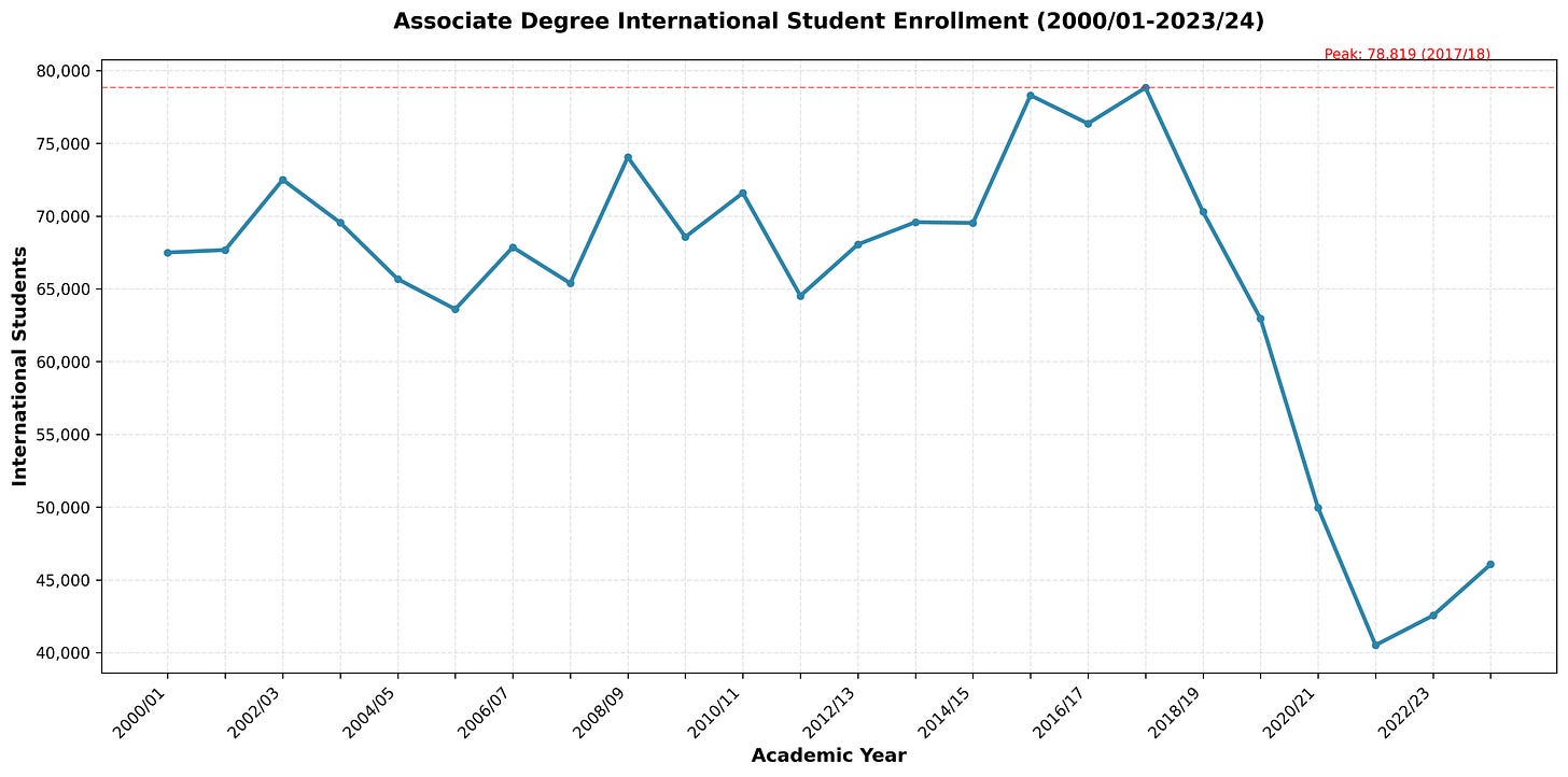 Community college international enrollment collapsed throughout 2017-2024, with the 2017-2020 period showing consistent double-digit declines that accelerated during COVID when community colleges lacked the resources and prestige to maintain international programs.