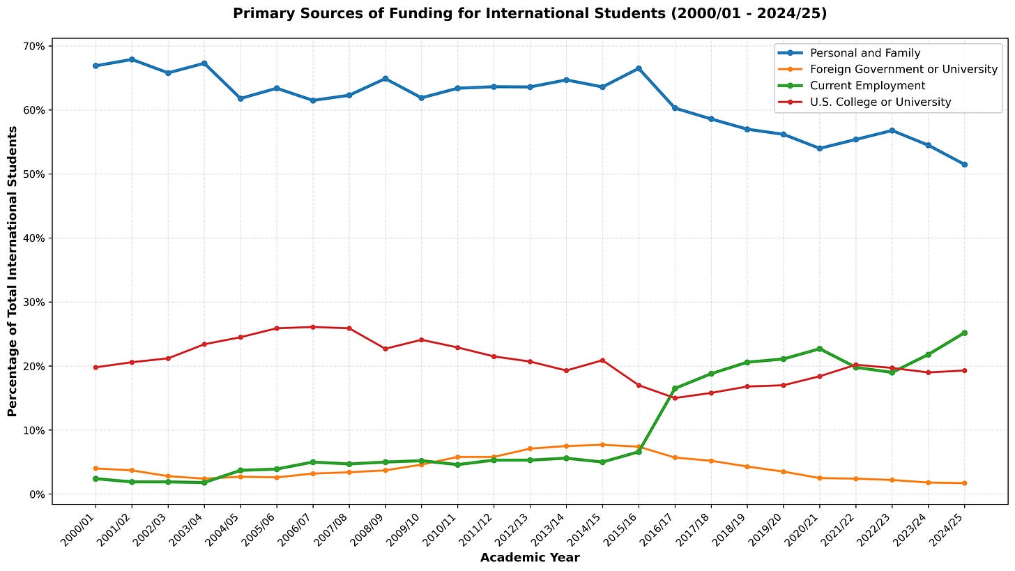 This category, which includes OPT work authorization, represented 2% in 2000/01, then began accelerating around 2015/16, growing explosively from 7% to over 25% by 2024/25. It’s now the second-largest funding source, nearly matching Personal and Family funding.