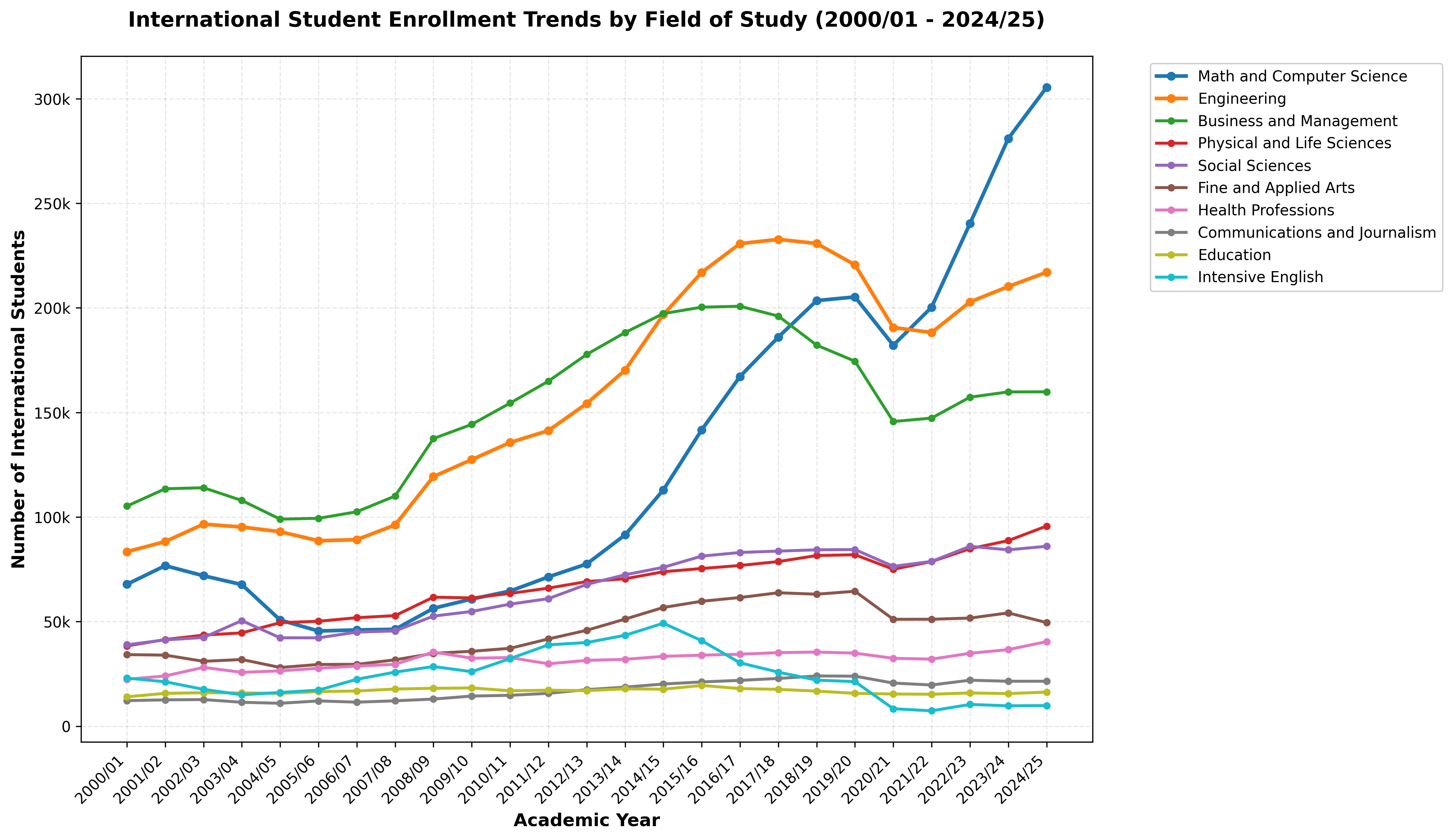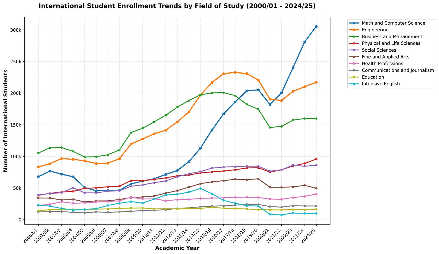 Look at the shifts post-Great Recession. The system consolidated into STEM dominance where Math and Computer Science alone (305,377 students) now enrolls more international students than the bottom nine fields combined.